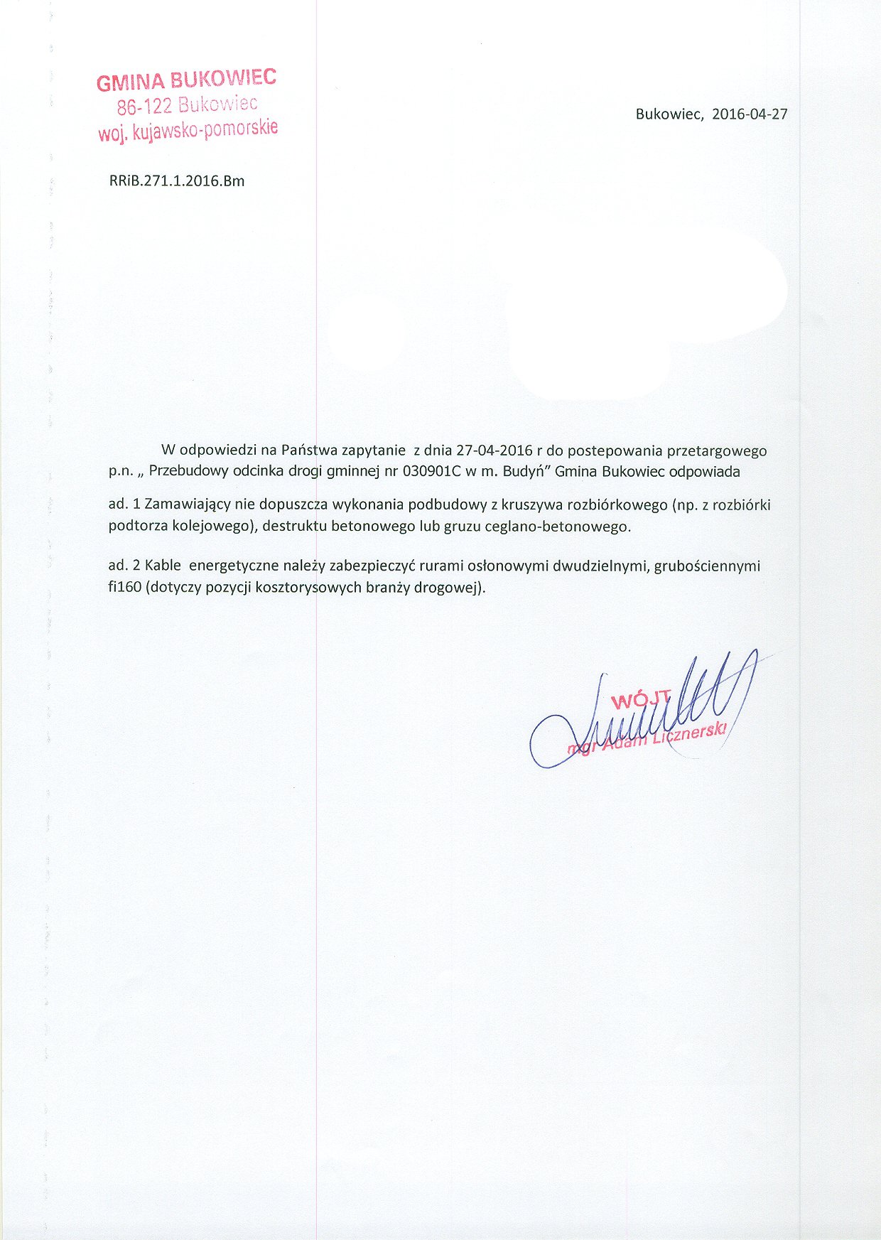| wytworzono: | data: - 15.04.2016 | przez: Adam Licznerski - Wójt Gminy Bukowiec | |