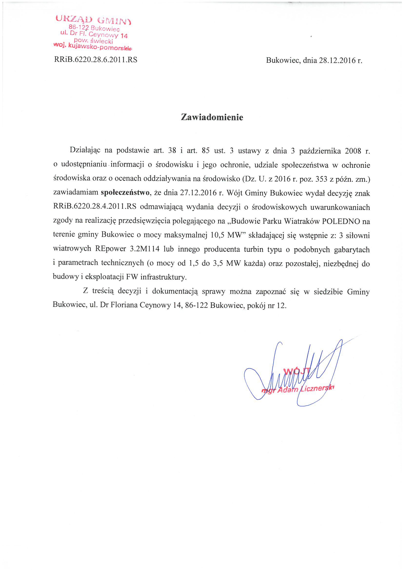 | wytworzono: | data: - 28.12.2016 | przez: Adam Licznerski - Wójt Gminy | |