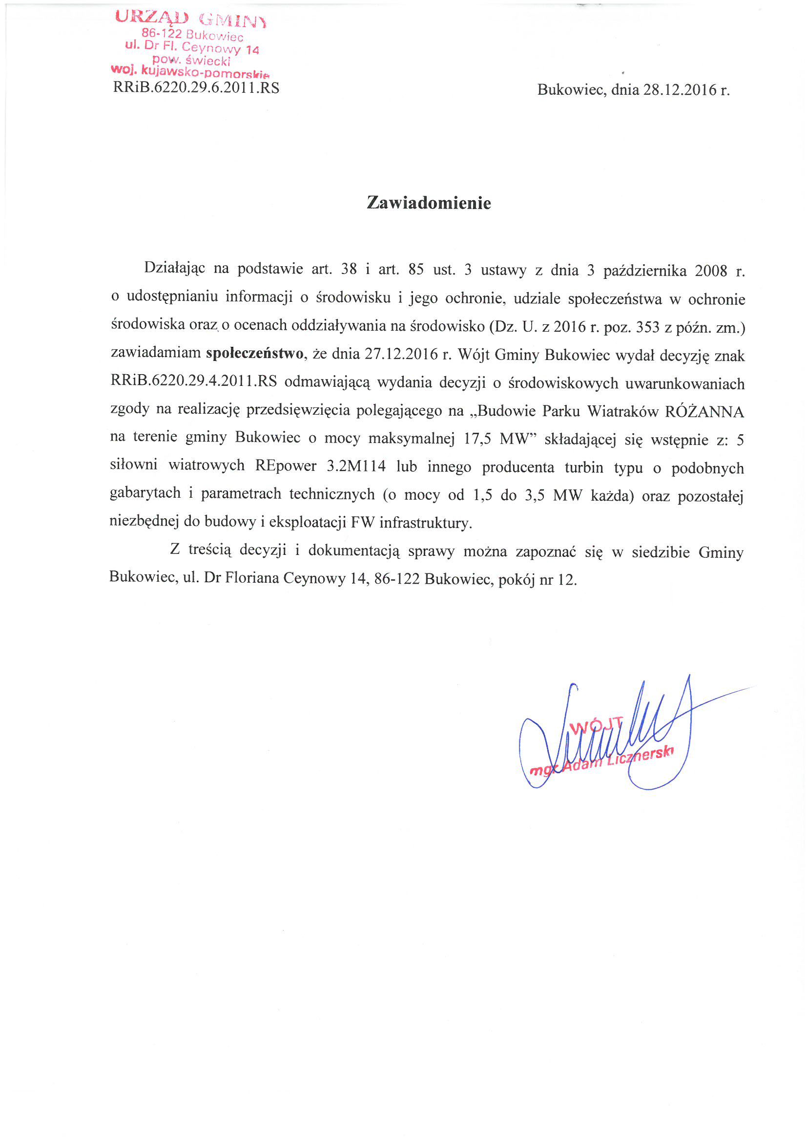 | wytworzono: | data: - 28.12.2016 | przez: Adam Licznerski - Wójt Gminy | |